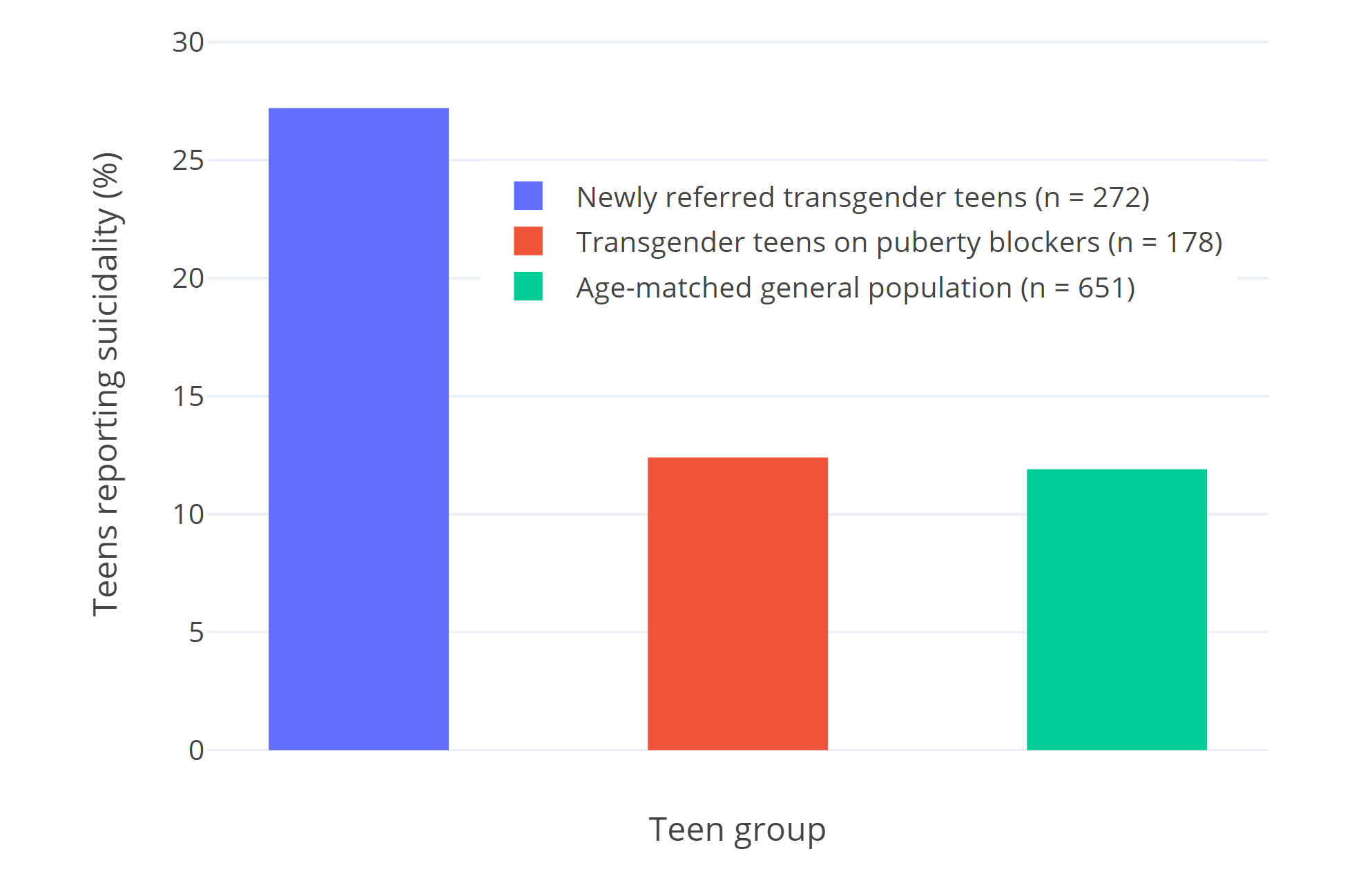 | Figure 2: Percentages of teens who report suicidality in van der Miesen et al. (2020). Suicidality was defined as endorsing the statement “I deliberately try to hurt or kill myself” or “I think about killing myself.” Suicidality among Dutch transgender youth has not significantly changed over time, making cohort differences unlikely (Arnoldussen et al., 2020). |
